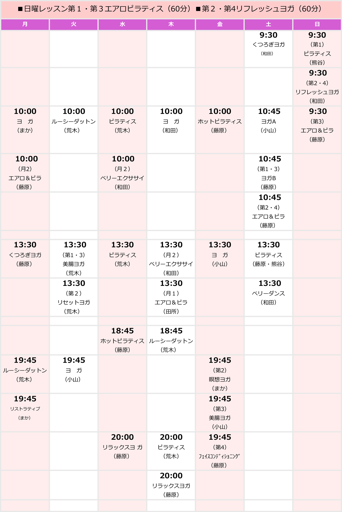75分レッスン:ヨガ/リストラティブヨガ/リラックスヨガ/ベリーダンス※その他レッスン60分です。 *都合により、インストラクター変更がある場合があります。*悪天候時はスタジオ休講になる場合があります。電話、もしくはスタジオブログをご確認ください。 レッスン時の注意事項 服 装 体のしめつけが少ない、運動可能な服装でお願いいたします。ガードル、ボディスーツ、ジーンズ等は控えてください。素足または5本指ソックスをおすすめしております。 持ち物 ヨガマット(斡旋しております。)タオル・飲み物持込み自由 食 事 レッスンの1時間前にお済ませください。